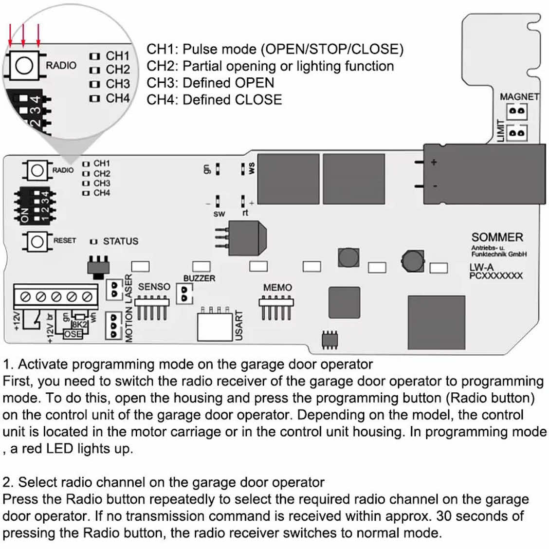Commencez par activer le mode de programmation sur le récepteur radio de l’opérateur. Pour cela, ouvrez le boîtier et appuyez sur le bouton de programmation (bouton radio) de l’unité de commande. Selon le modèle, cette unité se trouve dans le chariot moteur ou dans son boîtier. En mode de programmation, une LED rouge s’allume.